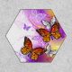 Orange, detailed monarch butterflies on light, purple, picturesque, painted background.