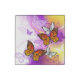 Orange, detailed monarch butterflies on light, purple, picturesque, painted background.