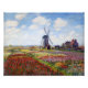 Monet Field of Tulips with Windmill print. Oil painting on canvas from 1886. One of Monet’s most colorful works painted around the Rijnsburg Windmill. The tulip fields are bursting with reds, whites, yellows and greens. A beautiful landscape painting that makes a great gift for fans of Claude Monet, tulips, impressionism, windmills, and French art.