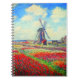 Notebook featuring Claude Monet’s flower and windmill painting. Beautiful and colorful fields of red, pink, and yellow tulips next to a windmill and house in Holland. A great Monet gift for fans of impressionism and French art.