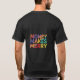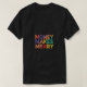 A vibrant t-shirt design features the phrase "Money Makes Merry" in a playful, multicolored font. Each letter bursts with a different bright color, like sunshine yellow, grassy green, and ocean blue, creating a fun and energetic look.