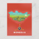 Mongolian illustrated map, landscape and prop plane blade vacation tourist poster against a vivid red background.