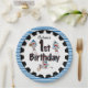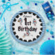 Sock Monkey Baseball 1st Birthday paper plates, a cute design that's great for kids who love sports, especially baseball, and cute monkeys! Features three sock monkey baseball players in baseball caps, one sliding into home plate, one up at bat, one getting ready to pitch the ball! Black polka dotted text reads 1st Birthday and there's a border of blue and white stripes and a black decorative ring. You can easily customize these sock monkey baseball 1st birthday paper plates with a name!
