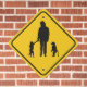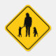 This is a funny yellow diamond warning sign in the style you'd see to advise traffic on the highway. Here the warning is a silly silhouette of a person standing with a pair of monkeys. They look like baboons. Wait, did you say monkeys? Baboons? At least one of them is holding the human's hand. I just hope they're going to cross at the crosswalk. There's nothing worse than jaywalking monkeys, you know. This is fun for fans of primates and anyone who loves or works with monkeys and baboons.