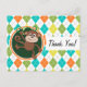 Cool, cute kids happy cartoon brown monkey swinging from vine on colorful argyle pattern; orange, green, teal, and yellow pattern. Great jungle, zoo animal theme kid's product!
