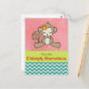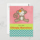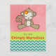 A postcard with an amusing monkey pun which says: You are chimply marvelous. A cute cartoon illustration of an adorable brown monkey sitting down. She has pink blushing cheeks for additional kawaii cuteness. As well as a little orange flower in her hair. Fun and whimsical design. Set on a background which is composed of a blue green chevron pattern and a pink shabby texture and a lime green banner stripe.