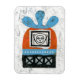 A whimsical design features a stylized monkey face enclosed in a square, surrounded by bold blocks of color and abstract shapes. The background consists of textured whites and grays, enhancing the playful composition.