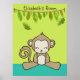 A brown girly monkey sitting down. Looking cute and kawaii with pink blushing cheeks. A banner of jungle leaves stretches across the top. Personalize with a child's name. Example: Elizabeth's Room. Perfect for a nursery or child's room. Set on a lime green and brown color scheme.