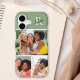 This iPhone case features space for 3 photos and is accented with a modern monogram at the top. The background color is sage green.