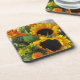 Beautiful sunflowers, blooming lily, safflower and green foliage decorate this set of six quality coasters. Easily change or remove the subtle monogram initials using the Template provided. Dimensions are 3.8"x3.8". Made with high-gloss plastic and a non-skid cork backing. See "About This Product" at side for more information. HIGH reviews.