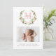 A pretty design to announce the arrival of your little girl. The top features a watercolor horseshoe wreath of pink and white roses with green leaves, with your daughter's initial in pink, overlaid with her name in gray. Show off your angel with a photo in the center. Birth details and sign off is at the bottom in dark gray. The reverse is in solid pink.