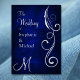 This beautiful wedding invitation in silver foil will give a sense of elegance to your wedding! The front right has a graceful swirl decoration adorned with a leaf. Your wedding text is at the left of the image. Everything is placed on a stunning deep royal blue abstract background. The back of the invitation is the same blue background, with your custom silver text in several fields. Easy to customize, and elegant for any season.