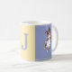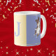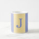 Know of anyone who has exciting news that makes you want to jump for joy to celebrate? Well this monogramed mug works really well to help convey that sentiment and congratulate someone! This is a fun, color block mug featuring a yellow square in between two blueish-purple squares with small lines at the top and bottom (either yellow or white depending on what color square it is crossing). On either side of the mug is an illustration of an Aussie excitedly jumping in the air. In the middle (in the yellow square) is a spot for you to customize with an initial. Add the initial of someone else to make a great gift, or go ahead and use your own to treat yourself and add a bright, cheerful addition to your kitchen. This mug is especially perfect for any dog lover or Australian shepherd owner.