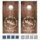 A rustic farm house dark barn brown wood corn hole set, with a pretty white line art floral wreath surrounding the couple's initials monogram within. Beneath are your first names and wedding date. A pretty rustic modern style newlywed gift. The white typography is decorative and stands out on the wood for a nice contrast.