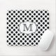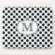 Monogram Mousepad with black polka dots on white background. Change monogram to your own. Initial framed in white marquee with black border