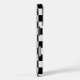 Cool iPhone case features a bold black and cream checkered pattern with a customizable monogram. Add (or delete) 3 initials in the sidebar to personalize it. The geometric checkerboard pattern is made of rows of alternating beige and black squares. Other case styles and models also available in the sidebar.