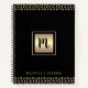 A faux gold foil square with a black script monogram initial and custom name, framed with horizontal gold oblong dot pattern bands on black, highlight this chic, girly, modern spiral journal notebook. 8 different inside paper designs to choose from. Makes a stylish statement every time you use it. A great gift for a friend, as well as yourself!