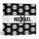 This black design features a soccer ball pattern background, along with a black monogram and name typography design that can be customized to your athlete.