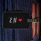A minimalist monogram design with large typography initials in a script font with a red heart on a simple black background. The perfectly custom gift or accessory!