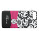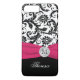 Monogrammed modern black and white floral damask pattern Case-Mate iPhone 7 Case with bright fuchsia pink PRINTED ribbon and PRINTED faux engraved look crystal brooch. Customize it to add your name, initial, or other text. If you need assistance, email niteowlstudio@gmail.com.