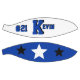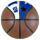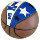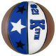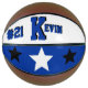 This is a full size basketball with two panels designed with a monogram name (large first letter) and uniform number, in popular college colors. This one is shown in blue, white, and black. The second panel has team colors with three stars. All text, art, and colors can be removed, or changed as desired. One panel can be left white for autographs, etc.