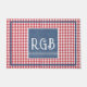 A trendy 24"x36" farmhouse doormat featuring a red & white buffalo check background and elegant white monogram initials on a textured blue denim print frame. Easily change the initials to make it yours using the Template provided. A smaller 18"x24" doormat is also available. Non-slip rubber that won't crack or buckle, this mat resists fading, mold, and mildew and can be easily cleaned with a hose. See "About This Product" at side for more information. TIP: change RGB initials to first and first name initials R&M for a wedding, anniversary, new home gift.
