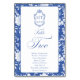 Delft blue floral table number card, designed in a refined blend of chinoiserie and French toile de Jouy style. The soft botanical illustrations frame an arched layout featuring an elegant wedding crest monogram, perfect for couples who love vintage, historic, and European-inspired aesthetics. Classic script typography pairs beautifully with the ceramic-blue palette, making this design an effortless nod to the tradition of “something blue.” Fully customizable with your guests names, wedding crest and in this design table number: Two, it’s an exquisite choice for any romantic or sophisticated wedding theme.