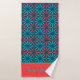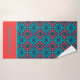 This modern design features a tiled pattern in red and blue with a personalized name at the base of the bath towel. Personalize by editing the text boxes provided.