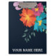 This is a botanical flowers decorate clipboard and it can be personalized with your name. The background color is a rich navy blue.