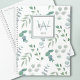 This pretty planner features a pattern of watercolor green leaves on a white background, overlaid with a rectangle with your monogram, name and year.