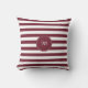 Monogrammed burgundy and white stripes patterned outdoor pillow.