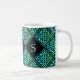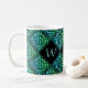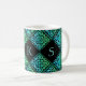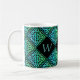 A monogram mug with 3 initials and a blue-green Celtic knot repeated diamond tile design against a black background. Personalize it with your initials!