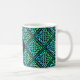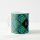 A monogram mug with a blue-green Celtic knot repeated diamond tile design against a black background. Personalize it with your initial!