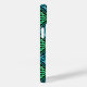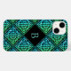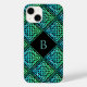 A black monogram iPhone 14 Case with a blue-green Celtic knot repeated diamond tile design. Make it personally yours with your very own monogram.