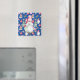 Christmas Pattern Blue Santa Gnome for Holidays kitchen magnet. Features a blue background pattern with gnomes, presents, holly, candy canes, Christmas trees, and Santa's bag. Personalize this with your monograms.