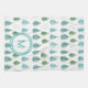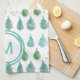 It is decorated with a watercolor pattern of Christmas trees and stars in shades of teal, turquoise and green on a white background.