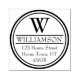 A classic circular personalized rubber stamp design featuring a double circle border with elegant monogram initial, name and return address text.