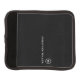 A minimalist monogrammed design with classic block monogram typography initials with personalized name below on a simple black background. Perfect travel accessory or custom gift for any occasion.