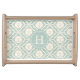 A blue and white serving tray with a sand dollar pattern on a rustic wood background. Personalize it with your monogram initial. Designed for you by Blackberry Boulevard.