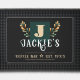 Fun personalized custom bar mat. Simple, stylish, elegant black and white design. Fat Font Bold Initial, family name, monogrammed coffee bar mat.