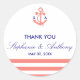 Monogrammed coral pink stripes and nautical anchor with navy blue accent wedding thank you sticker. The design features a coral pink and white striped pattern, a coral pink nautical anchor with bride's and groom's initials in navy blue, also the bride and groom's names and the date.