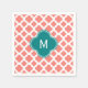 Monogrammed coral pink quatrefoil pattern with teal paper napkins. Pink quatrefoil patern on white. A teal quatrefoil shape in the middle.