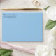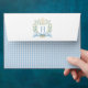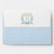 This envelope has a preppy grandmillennial design featuring a blue gingham pattern on the back flap with a crest your can personalize with your initial. The back and the inside have a coordinating floral pattern.