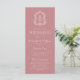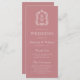 This elegant vintage-inspired wedding program features a pair of white monogram initials in open serif font above and below a dividing line and encircled by a line art botanical crest on a dusty rose background.