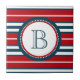 Nautical themed design with monogram decoration in round shape with rope illustration on blue, red and white striped background
