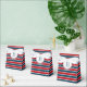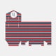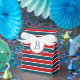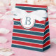 Nautical themed design with monogram decoration in round shape with stars on blue, red and white striped background