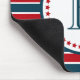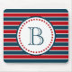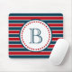 Nautical themed design with monogram decoration in round shape with stars on blue, red and white striped background
