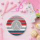 Nautical themed design with monogram decoration in round shape on blue, white, red and grey striped background