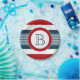 Nautical themed design with monogram decoration in round shape on blue, white and red striped background