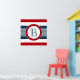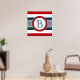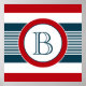 Nautical themed design with monogram decoration in round shape on blue, white and red striped background
